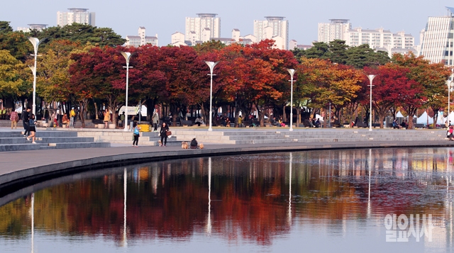 24일 서울 상암동 평화의공원을 찾은 시민들이 단풍을 보며 가을의 정취를 만끽하고 있다.