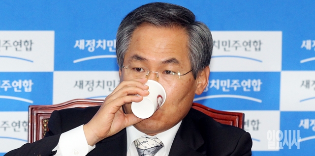 우윤근 새정치민주연합 원내대표가 27일 서울 여의도 국회에서 열린 비상대책위원회의에서 물을 마시고 있다.