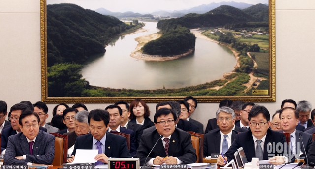 이동필 농림수산식품부 장관(왼쪽에서 세번째)이 27일 서울 여의도 국회에서 열린 농림축산식품해양수산위원회의 종합감사에서 의원들의 질의에 답하고 있다. 왼쪽부터 현명관 한국마사회 회장, 이양호 농촌진흥청장, 이 장관, 여인홍 농림축산식품부 차관.