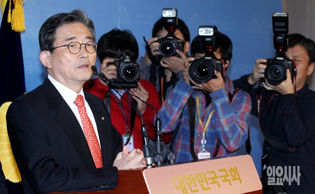새누리당 공무원연금 개혁 태스크포스(TF) 이한구 위원장이 27일 서울 여의도 국회 정론관에서 기자회견을 열고 당의 공무원연금 개혁안을 발표하고 있다.