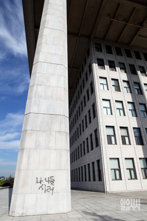 지난 26일 서울의 한 사립대 학생 2명이 국회 본청 후문 쪽 기둥에 '나 니들 시러(싫어)'라고 낙서를 한 흔적이 27일에도 여전히 남아있다. 이들은 공용건조물 침입 및 공용물건손상 혐의로 불구속 입건됐다.
