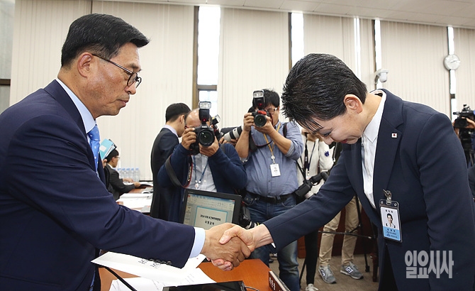 27일, 서울 여의도 국회 보건복지부 국정감사 직전, 증인으로 출석한 김성주 대한적십자사 총재가 김춘진 보건복지위원장(사진 왼쪽)과 악수를 나누고 있다.
