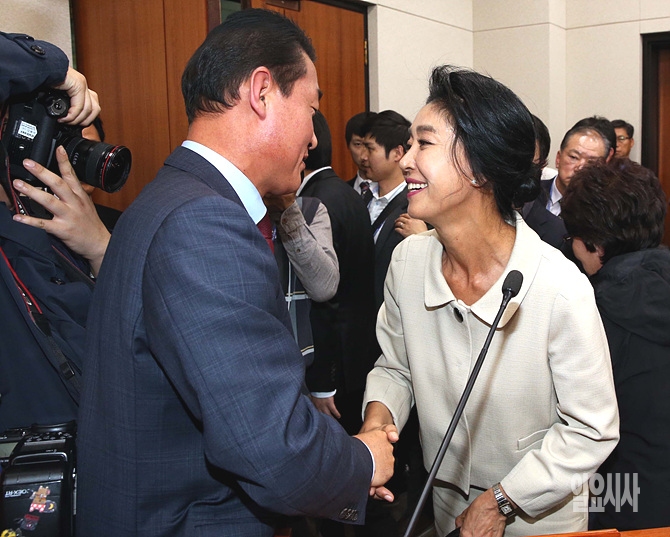 27일, 배우 김부선씨가 서울 여의도 국회 국토교통위원회 국정감사에 참고인 자격으로 출석한 가운데 퇴장하는 새누리당 황영철 의원과 악수를 나누고 있다.