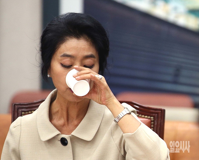 27일, 배우 김부선씨가 서울 여의도 국회 국토교통위원회 국정감사에 참고인 자격으로 출석한 가운데 잠시 목이 타는 듯 물을 들이키고 있다.
