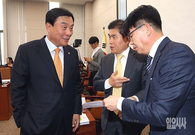 27일, 서울 여의도 국회 국토교통위원회 국정감사에서 박기춘 국토위원장(새정치민주연합, 사진 왼쪽)이 관계자들과 이야기를 나누고 있다.