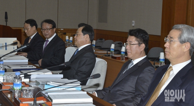 이병기 국정원장(가운데)이 28일 서울 서초구 내곡동 국가정보원에서 열린 국회 정보위원회의 국정원에 대한 국정감사에서 자리에 착석해 있다. 왼쪽부터 이헌수 기조실장, 한기범 1차장, 이병기 원장, 김수민 2차장, 김규석 3차장.