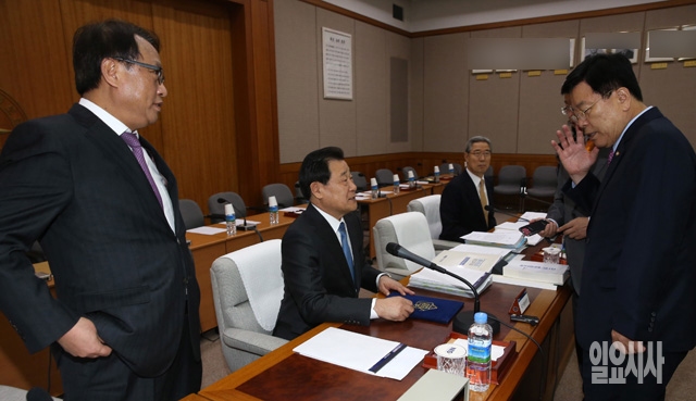 28일 서울 서초구 내곡동 국가정보원에서 열린 국회 정보위원회의 국정원에 대한 국정감사에서 이병기 국정원장(왼쪽에서 두번째)과 김광림 국회 정보위원장(맨 오른쪽)이 국감 시작 전 의견을 나누고 있다.
