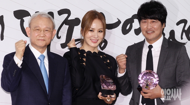 배우 송강호(맨 오른쪽)와 엄정화가 28일 서울 소공동 롯데호텔에서 열린 제51회 대종상영화제 기자간담회에서 이규태 조직위원장에게 홍보대사 위촉패를 받은 뒤 기념촬영을 하고 있다.