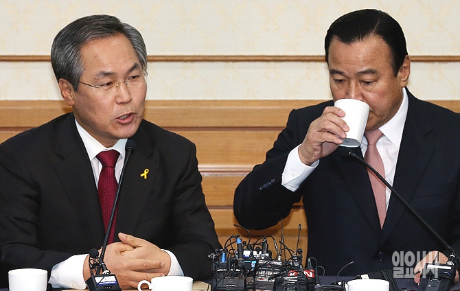 28일, 서울 여의도 국회에서 이완구-우윤근 원내대표, 주호영-백재현 정책위의장 등이 주례회동을 갖고 있는 가운데 우 원내대표가 모두발언하고 있다.