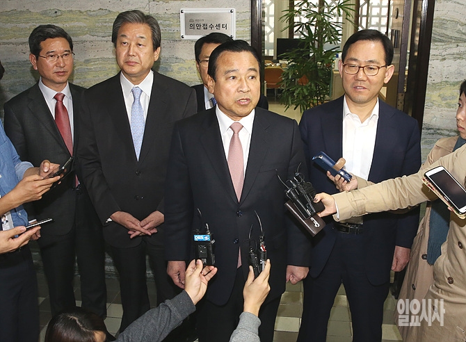 28일 오후, 새누리당 이완구 원내대표(사진 가운데)가 김무성 대표(사진 왼쪽에서 두 번째), 김학용 대표비서실장(사진 왼쪽) 등 지도부와 함께 서울 여의도 국회 의안과 앞에서 공무원연금 개혁안(공무원연금법 일부개정법률안) 제출 직후 기자들의 질문에 답변하고 있다.
