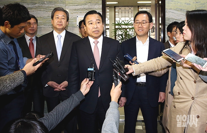 28일 오후, 새누리당 이완구 원내대표가 김무성 대표, 김학용 비서실장 등 지도부와 함께 공무원연금 개혁안 제출 직후 기자들의 질문에 답변하고 있다.