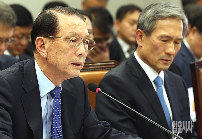 28일, 서울 여의도 국회에서 열린 국회 운영위 국정감사에서 증인으로 출석한 김기춘 비서실장이 의원들의 질의에 답변하고 있다.