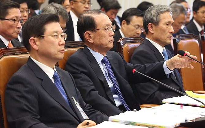 28일, 서울 여의도 국회에서 열린 국회 운영위 국정감사에 김기춘 대통령 비서실장(사진 가운데)이 증인으로 출석해 있다.