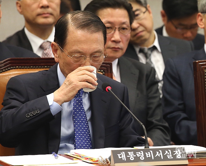 28일, 서울 여의도 국회에서 열린 국회 운영위 국정감사에서 증인으로 출석한 김기춘 비서실장이 목이 타는 듯 물을 들이키고 있다.