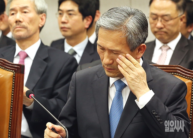 28일, 서울 여의도 국회에서 열린 국회 운영위 국정감사에서 증인으로 출석한 김관진 청와대 국가안보실장이 의원들의 질의를 받고 잠시 고민에 빠져 있다.