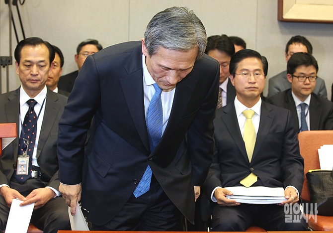 28일, 서울 여의도 국회에서 열린 국회 운영위 국정감사에서 증인으로 출석한 김관진 청와대 국가안보실장이 의원들에게 인사를 하고 있다.