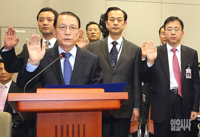 28일, 서울 여의도 국회에서 열린 국회 운영위 국정감사에서 증인으로 출석한 김기춘 대통령 비서실장과 관계자들이 성실한 답변을 하겠다며 선서를 하고 있다.