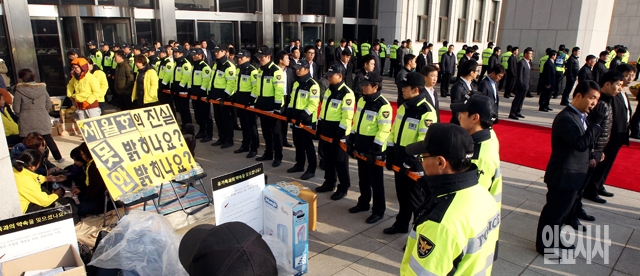 박근혜 대통령이 29일 국회에서 시정연설을 할 예정인 가운데 국회 본관 옆에 농성중인 세월호 유가족 주위를 경찰병력들이 둘러싸고 있다.