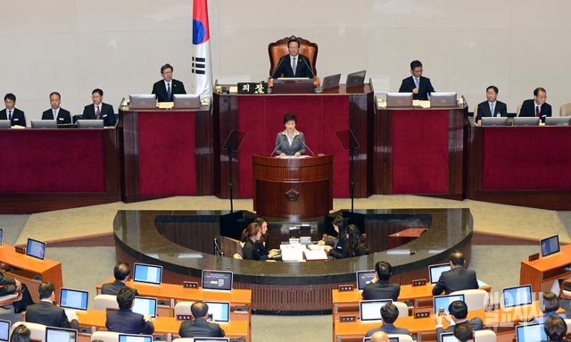 박근혜 대통령이 29일 서울 여의도 국회 본회의장에서 2015년도 예산안 및 기금운용계획안에 대한 정부의 시정연설을 하고 있다.