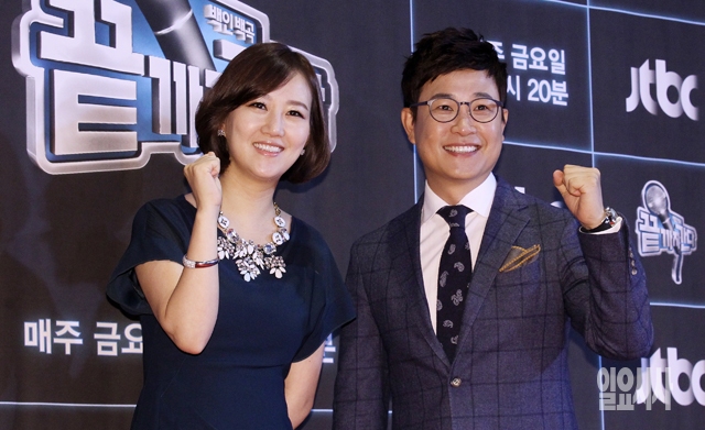 29일 서울 중구 호암아트홀에서 열린 JTBC 예능프로그램 '백인백곡-끝까지 간다'(연출 김형중) 제작발표회에서 MC인 김성주(오른쪽)와 장윤정이 포토타임을 갖고 있다.