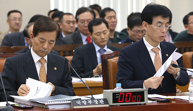 29일, 서울 여의도 국회 국방위원회 회의실에서 열린 예산안 심의 등에 대한 전체회의에 한민구 국방부장관(사진 왼쪽)과 이용걸 방위사업청장이 출석해 있다.