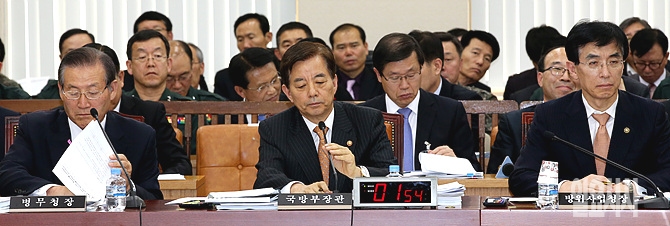 29일, 서울 여의도 국회 국방위원회 회의실에서 열린 예산안 심의 등에 대한 전체회의에 한민구 국방부장관(사진 가운데), 이용걸 방위사업청장(사진 오른쪽), 박창명 병무청장이 출석해 있다.