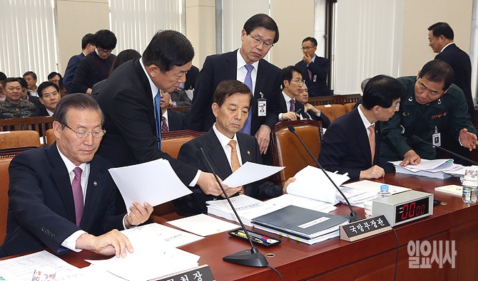29일 서울 여의도 국회 국방위원회 회의실에서 열린 예산안 심의 전체회의에서 한민구 국방부장관(사진 가운데)이 관계자로부터 보고를 받고 있다.