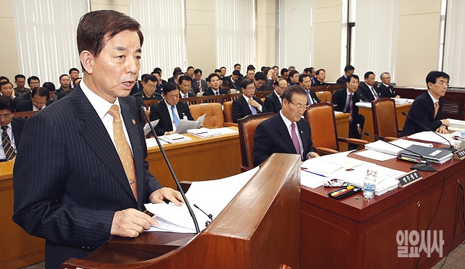 29일 서울 여의도 국회 국방위원회 회의실에서 열린 예산안 심의 전체회의 직전, 한민구 국방부장관이 업무보고를 하고 있다.