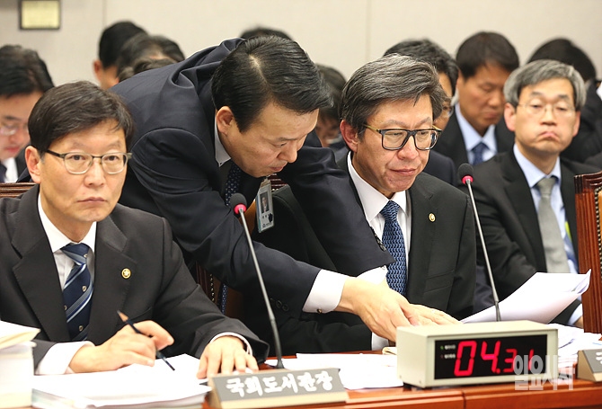 29일 오후, 서울 여의도 국회 운영위원회 회의실에서 열린 운영위 국정감사에서 박형준 국회 사무총장이 사무처 관계자로부터 구두보고를 받고 있다.