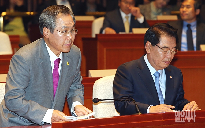 29일, 서울 여의도 국회에서 열린 새정치민주연합 의원총회에 우윤근 원내대표와 백재현 정책위의장이 참석해 있다.
