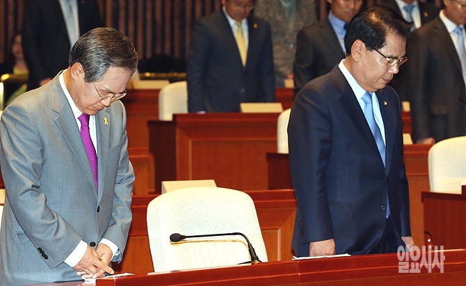 29일, 서울 여의도 국회에서 열린 새정치민주연합 의원총회 직전, 우윤근 원내대표와 백재현 정책위의장이 묵념하고 있다.