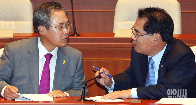 29일, 서울 여의도 국회에서 우윤근 새정치민주연합 원내대표(사진 왼쪽), 백재현 정책위의장이 의원총회 도중 이야기를 나누고 있다.