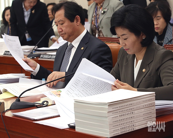 29일, 서울 여의도 국회에서 열린 여성가족위원회 국정감사에 증인으로 출석한 김희정 여성가족부장관이 답변자료를 살피고 있다.