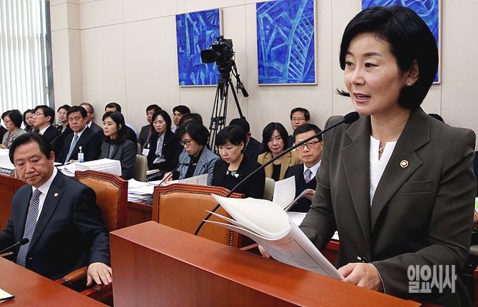 29일, 서울 여의도 국회에서 열린 여성가족위원회 국정감사에서 김희정 여성가족부장관이 업무보고를 하고 있다.