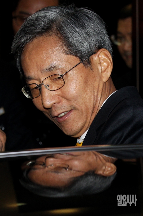 윤종규 KB금융지주 회장 후보가 29일 서울 중구 명동 KB금융지주 본점에서 열린 'KB금융지주 제6차 회장후보추천위원회(이하 회추위) 및 임시이사회'를 마친 뒤 차량에 탑승하고 있다. 이날 회추위는  윤 후보에 대한 자격검증을 실시하여 결격사유가 없음을 확인하고 회장후보로 추천결의 했다. 내달 21일 임시주주총회와 이사회를 거쳐 윤 후보를 대표이사 회장으로 선임할 예정이다.