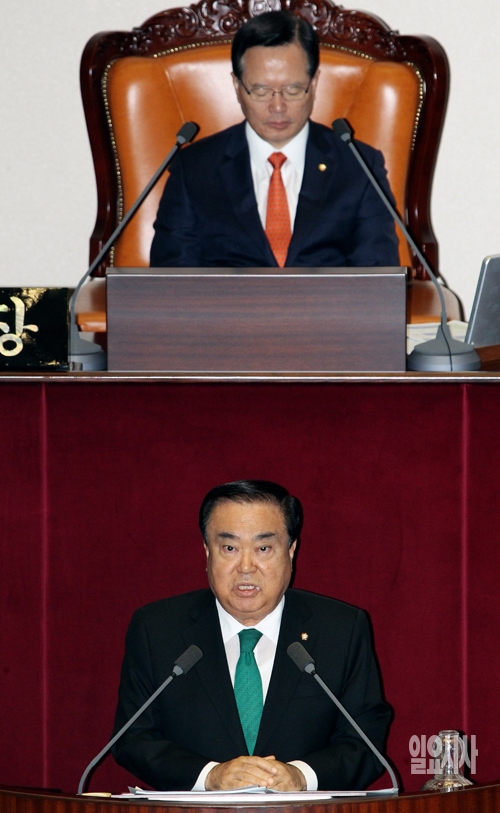 문희상 새정치민주연합 비상대책위원장이 30일 서울 여의도 국회에서 열린 본회의에서 교섭단체 대표연설을 하고 있다.