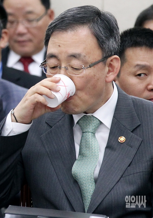 최성준 방송통신위원장이 30일 서울 여의도 국회에서 열린 미래창조과학방송위원회 전체회의에서 물을 마시고 있다.