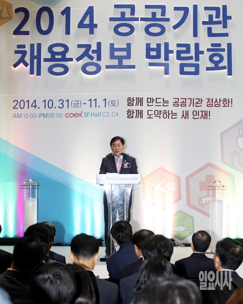 최경환 부총리겸 기획재정부 장관이 31일 서울 삼성동 코엑스에서 열린 2014 공공기관 채용정보 박람회 개회식에서 인사말을 하고 있다.