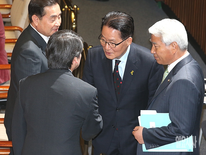 3일, 서울 여의도 국회에서 열린 외교·통일·안보에 관한 대정부 질문에서 새정치민주연합 박지원 의원과 안철수 전 공동대표가 악수를 나누고 있다.