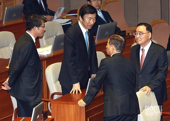 3일, 서울 여의도 국회 본회의장에서 열린 외교·통일·안보에 관한 대정부 질문 직전, 정홍원 국무총리, 윤병세 외교·한민구 국방부장관 등이 이야이를 나누고 있다.