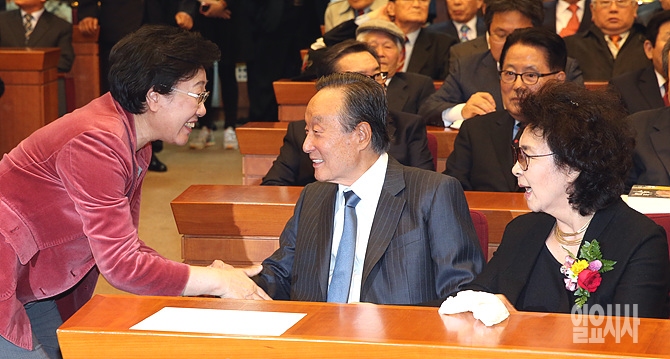 3일, 서울 여의도 국회 헌정기념관에서 열린 고 김대중 전 대통령의 가신으로 통하는 동교동계 권노갑 새정치민주연합 상임고문이 출판회에서 한명숙 새정치민주연합 의원과 악수를 나누고 있다.