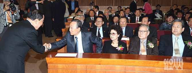 3일, 서울 여의도 국회 헌정기념관에서 열린 고 김대중 전 대통령의 가신으로 통하는 동교동계 권노갑 새정치민주연합 상임고문 출판회 직전, 문희상 새정치민주연합 비대위원장이 권 상임고문과 악수를 나누고 있다.