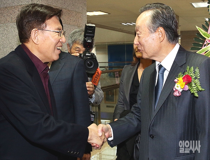 3일, 서울 여의도 국회 헌정기념관에서 열린 동교동계 권노갑 새정치민주연합 상임고문 출판회에 김덕룡 전 장관(사진 왼쪽)이 권 상임고문과 악수를 나누고 있다.