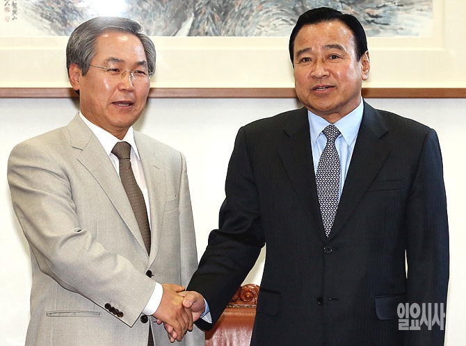 4일, 새누리당 이완구-새정치민주연합 우윤근 원내대표(사진 왼쪽)가 서울 여의도 국회 운영위원장실에서 여야 주례회동을 갖기 전, 악수를 나누고 있다.