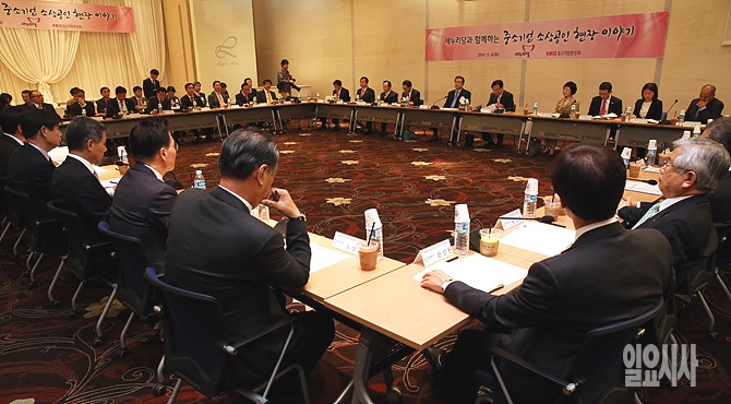 4일, 서울 여의도 중소기업중앙회에서 새누리당 김무성 대표, 주호영 정책위의장 등 지도부와 김기문 중소기업중앙회장 등 중기 인사들이 참석한 가운데 '새누리당과 함께하는 중소기업·소상공인 현장이야기' 간담회를 열고 있다.