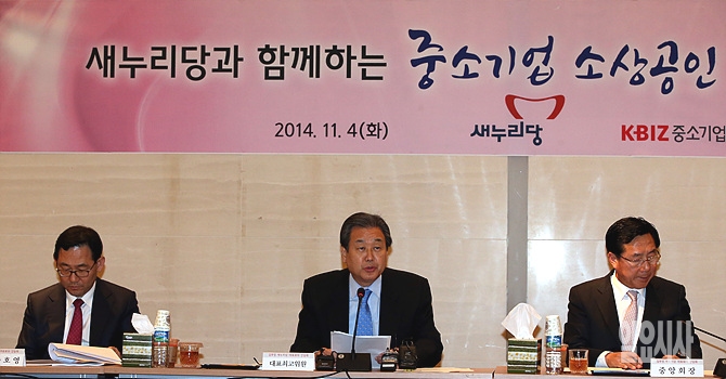 4일, 서울 여의도 중소기업중앙회에서 새누리당 김무성 대표(사진 가운데), 주호영 정책위의장 등 지도부와 김기문 중소기업중앙회장 등 중소기업 인사들이 참석한 가운데 '새누리당과 함께하는 중소기업·소상공인 현장이야기' 간담회에서 김 대표가 모두발언하고 있다.