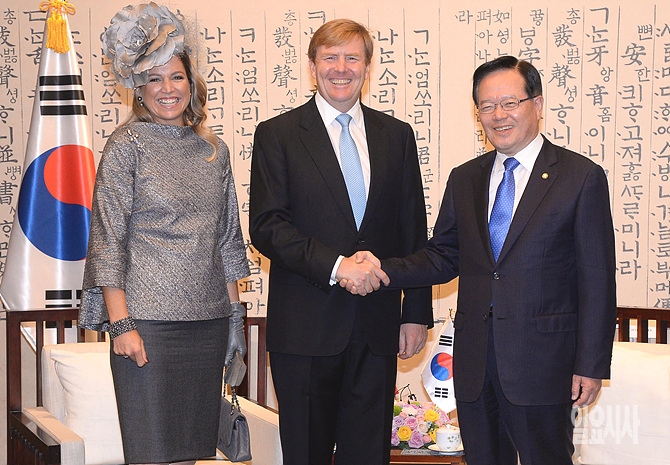 4일, 서울 여의도 국회에서 정의화 국회의장이 빌럼 알렉산더르 네덜란드 국왕을 예방한 자리에서 악수를 나누고 있다. (사진공동취재단)