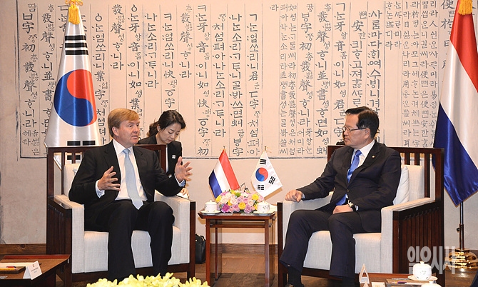 4일, 서울 여의도 국회에서 정의화 국회의장이 빌럼 알렉산더르 네덜란드 국왕과의 예방에서 환담을 나누고 있다. (사진공동취재단)