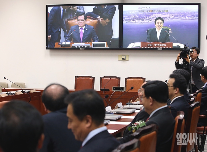 11일 오후, 서울 여의도 국회 영상회의실에서 첫 오픈한 화상회의장비를 테스트하고 있는 가운데, 의원들이 정의화 국회의장과 원희룡 제주도지사와의 화상회의 시연을 지켜보고 있다.