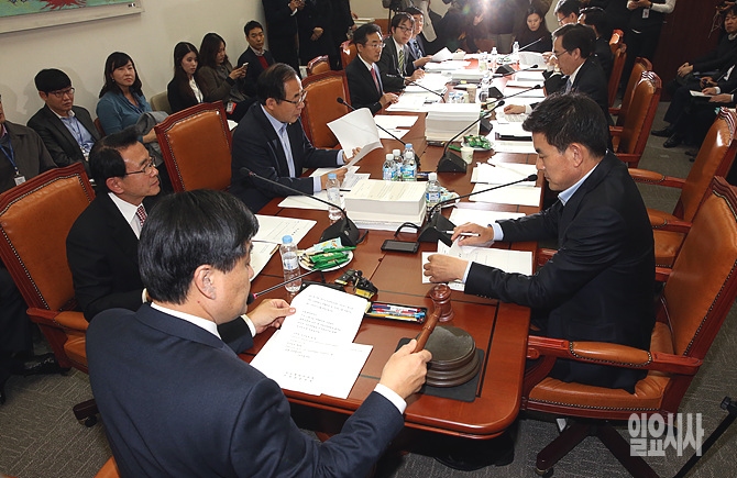 13일, 서울 여의도 국회에서 한-호주·캐나다 FTA 비준동의안 처리를 위한 외교통일위원회 법안심사소위원회에서 심윤조 소위원장이 회의 시작을 알리는 의사봉을 두드리고 있다.